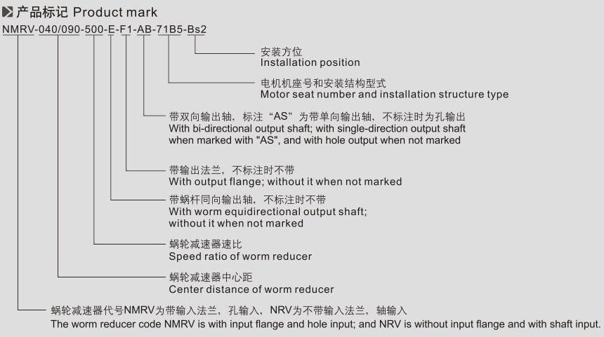 MB無級變速機(jī)標(biāo)記有:NMRV-040/090-500-E-F1-AB-71B5-Bs2